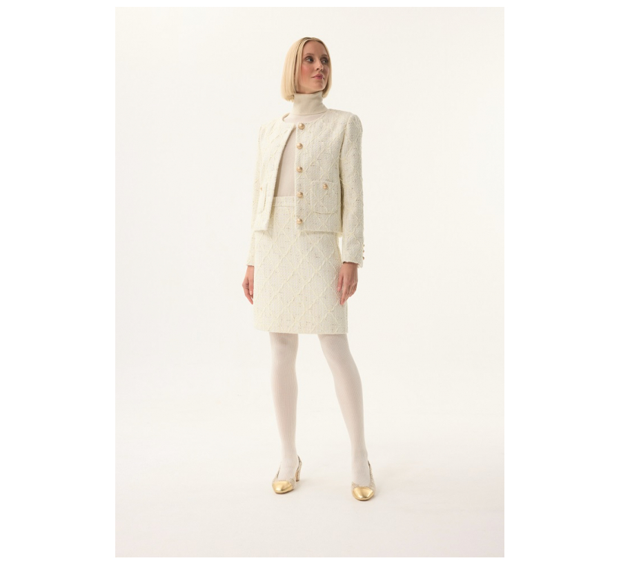 Letisztult off-white (bézs-fehér) zakó Leo & Ugo-tól, arany díszgombokkal és strukturált anyaggal. Kortárs női szabás, ideális választás rendezvényre vagy elegáns hétköznapokra — finom árnyalat, amely kiemeli stílusodat.60% Polyester, 30% Acrylic, 10% Laine