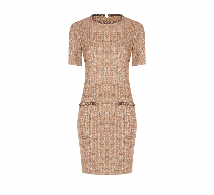 Elegáns camello-baige ruha Rinascimento-tól, testhezálló sztreccs buklé anyagból, két díszzsebbel elöl és hátul zipzárral. Olasz stílus, kifinomult vonalak – tökéletes választás üzleti vagy alkalmi megjelenéshez. Made in Italy.