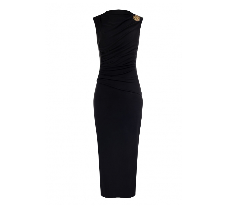 Klasszikus fekete koktélruha Rinascimento-tól, karcsúsított szabással és kifinomult részletekkel. Tökéletes választás különleges alkalmakra, esti eseményekre – elegancia és nőiesség egy darabban.