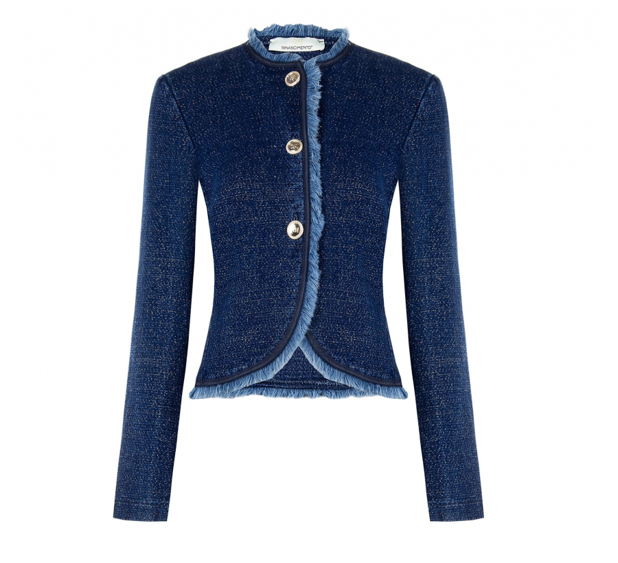 Stílusos kék farmer zakó Rinascimento-tól, arany szálas anyaggal díszítve, karcsúsított szabással és két gombbal. Elegáns fazon, amely modern urban lookot kölcsönöz – ideális választás casual és alkalmi szettekhez is.