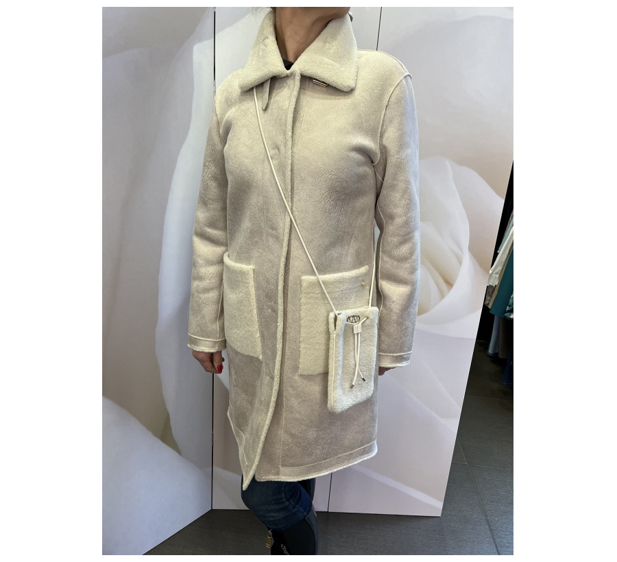 Stílusos törtfehér kabát Rinascimento-tól, 3/4 hosszú fazonban, elöl patentos záródással és kapucnival. Modern női szabás, amely ideális választás elegáns és hétköznapi megjelenéshez is — könnyű meleg réteg az átmeneti időszakokra egy átlapolós kisméretű táskával.