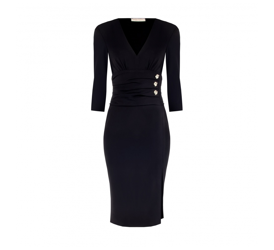 Stílusos fekete ruha Rinascimento-tól: mell alatt lefelé ráncolt derékrész, három diszgomb elöl, és bal oldali magas slicc – anyagösszetétel: 75 % poliészter, 5 % elasztán. Elegáns választás estélyekre, rendezvényekre, amikor a klasszikus fekete ruha finom részletekkel emelkedik ki.