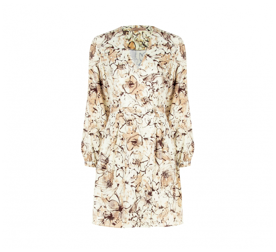 Elegáns bézs (beige) ruha Rinascimento-tól, deréknál szabott felsőrésszel és bővülő szoknyarészsel. Elöl gombbal záródik, virágmintás díszítéssel – kifinomult, nőies választás különleges alkalmakra vagy üzleti eseményekre.