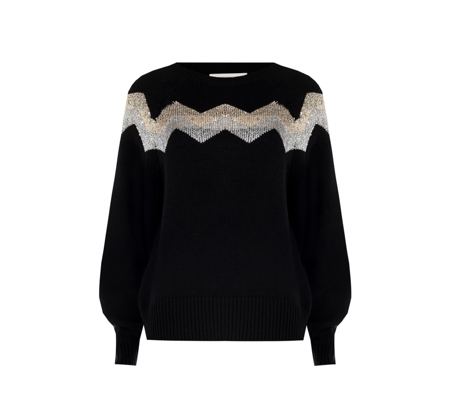 Stílusos fekete pulóver Rinascimento Vario kollekcióból: finom kötött mintázattal, karcsúsított fazonnal és laza, kényelmes szabással. Ideális választás hűvös napokra – viseld farmerrel vagy elegáns szoknyával a letisztult, „made in Italy” megjelenésért.