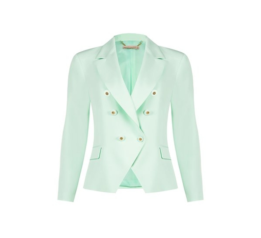 A Rinascimento verde menta zakó a modern elegancia és a friss színvilág tökéletes kombinációja. A menta zöld árnyalat könnyed, nőies megjelenést biztosít, miközben stílusos alternatívát nyújt a klasszikus fekete vagy bézs darabok helyett.